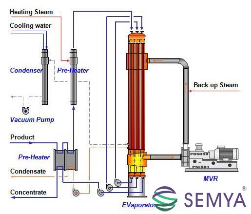 蒸汽機械再壓縮蒸發器簡稱MVR蒸發器,相較于傳統的多效蒸發,是一種高效、節能的技術。MVR蒸發器是指機械式熱能壓縮蒸發器,是國際上二十世紀九十年代末開發出來的新型高效蒸發設備。其工作原理是蒸發器產生的二次蒸汽經機械式熱能壓縮機(類似于鼓風機)作用后,溫度提升5~8℃,返回用于蒸發器的加熱熱源,新鮮蒸汽僅用于補充熱損失和補充進出料熱焓,從而大幅度減低蒸發器對外來新鮮蒸汽的消耗。原來要廢棄的蒸汽就得到了充分的利用,回收了潛熱,又提高了熱效率,生蒸汽的經濟性相當于多效蒸發的30效,減少了對外部加熱及冷卻資源的需求,降低能耗,減少污染。