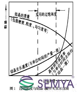 對結晶影響最主要的因素是溶液的過飽和度,如果溶液沒有過飽和度,晶核既不能生成,結晶也不能生長。過飽和度大一些對生產有利,因為推動力大,晶核的形成速率和結晶的生長速率都大,但也不是越大越好。如果料液過飽和度太大,晶核形成速率很快上升,使結晶生長速率降低,會出現產品粒度過細,影響產品質量。過飽和度與結晶、操作關系示意如圖1 所示