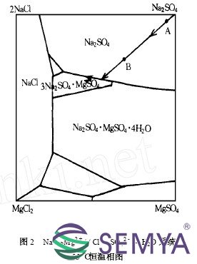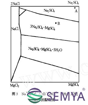 無水硫酸鈉生產所使用的原料中,除了主要的Na+ 、SO42 -離子外,一般都含有少量的Ca2 + 、Mg2 + 、和Cl -離子,生產時蒸發器內壓力、溫度等條件保持不變,隨著蒸發的進行,結晶的硫酸鈉不斷取出, 料液中Ca2 + 、Mg2 + 離子濃度相對增大, 體現在Na + 、Mg2 + // Cl -、SO42--H2O 相圖上,如開始在A 點,生產一段時間后體系移到B 點見圖2, 繼續生產,體系逐漸由Na2SO4 的結晶區移到Na2SO4 與復鹽3Na2SO4 ·MgSO4 的共飽線上,此時無水鈉鎂礬開始析出,在操作溫度不變情況下,體系將沿此共飽線移動,產品質量開始下降。如果溫度升高時,Na2SO4 的結晶區逐漸縮小,而3Na2SO4 ·MgSO4 的結晶區逐漸增大, 體系落在了3Na2SO4 ·MgSO4的結晶區,顯然此時已不是我們所需要的產品了見圖3 。由于無水鈉鎂礬的結晶顆細小,在粘度較大的硫酸鈉溶液中不易沉降,蒸發罐內就會呈現糊狀,使蒸發無法正常進行,結晶也不會再繼續長大,排出的料液經離心機脫水非常困難,濕硝中母液含量較大,氣流干燥也無法正常運行,產品放置時間長了便結為大塊。為避免上述現象發生,除對硝液進行凈化外,應適當降低排料溫度,即降低蒸發終溫。從圖2 、圖3 中可以看出,Na2SO4的結晶區隨著溫度的降低而增大,這不僅提高了產品產量,而且極大的降低了雜鹽的析出量,大大提高了產品質量。那么是不是排料溫度越低越好呢? 也不是,圖4 是Na2SO4 -H2O 系統相圖,從圖中可以看出,硫酸鈉溶解度在32138 ℃最大,低于此溫度時,系統不再結晶Na2 SO4 , 而是結晶出Na2 SO4 ·10H2O 。當料液溫度接近32138 ℃時, 由于硫酸鈉溶解度增大,產量將受到影在水中響, 這對生產是不利的。